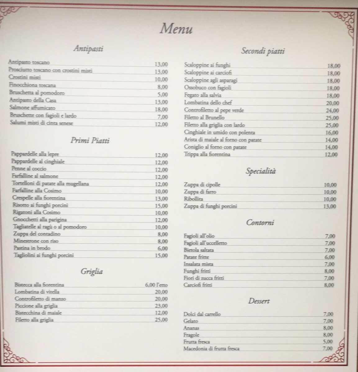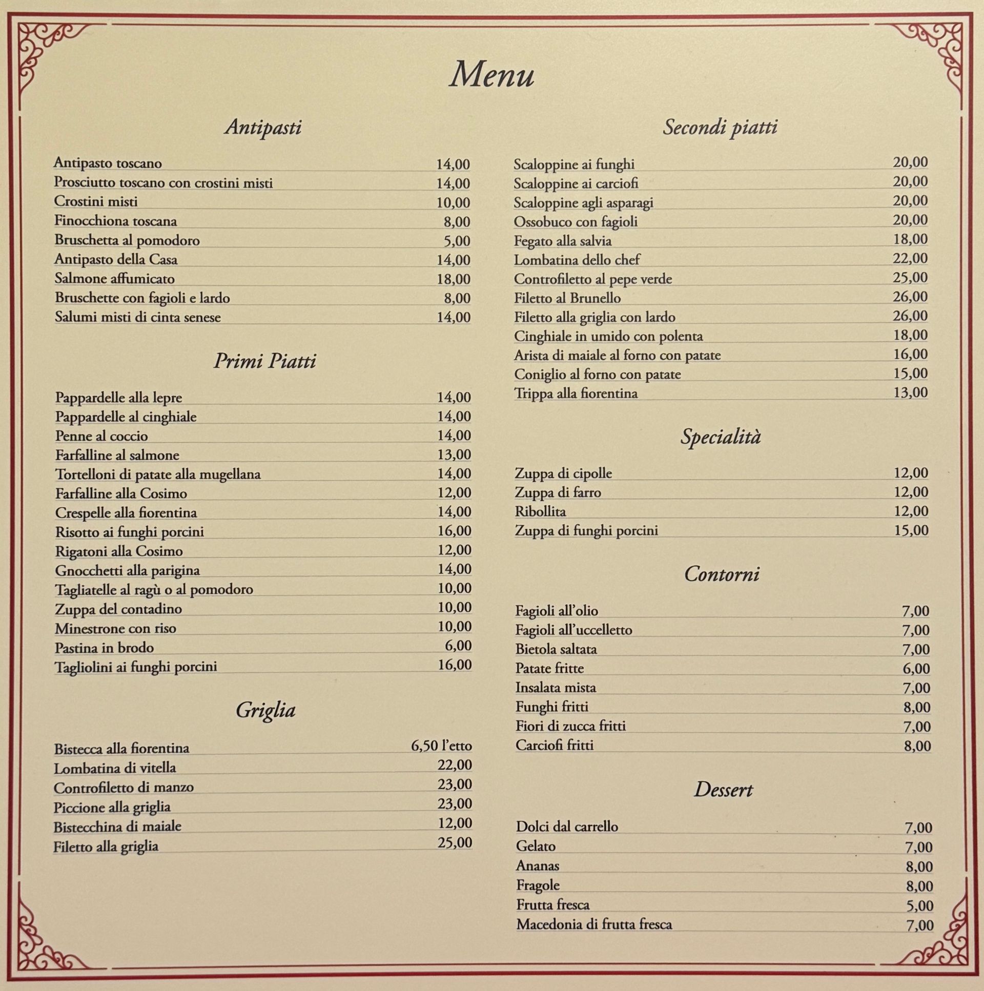 In questa pagine trovate i migliori piatti del Ristorante Cosimo De' Medici, venite ad assaporare prelibate pietanze della tradizione culinaria toscana: dagli antipasti di salumi, formaggi e bruschette, ai primi di pasta fresca e zuppe, fino ai migliori tagli di carne cotte sulla griglia come l'immancabile Fiorentina.